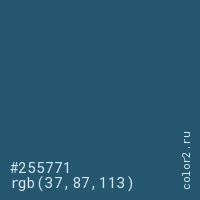 Цвет #255771 в цветовой модели RGB обозначается тремя октетами (37, 87, 113) в десятичном формате и #255771 в шестнадцатиричном (hex) формате, которые являются интенсивностью красного 37 (hex 25), интенсивность зелёного 87 (hex 57) и интенсивность синего 113 (hex 71).