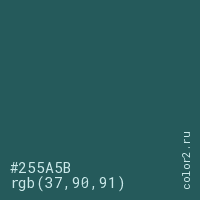 Цвет #255A5B в цветовой модели RGB обозначается тремя октетами (37, 90, 91) в десятичном формате и #255A5B в шестнадцатиричном (hex) формате, которые являются интенсивностью красного 37 (hex 25), интенсивность зелёного 90 (hex 5A) и интенсивность синего 91 (hex 5B).