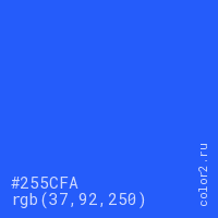 Цвет #255CFA в цветовой модели RGB обозначается тремя октетами (37, 92, 250) в десятичном формате и #255CFA в шестнадцатиричном (hex) формате, которые являются интенсивностью красного 37 (hex 25), интенсивность зелёного 92 (hex 5C) и интенсивность синего 250 (hex FA).