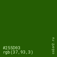 Цвет #255D03 в цветовой модели RGB обозначается тремя октетами (37, 93, 3) в десятичном формате и #255D03 в шестнадцатиричном (hex) формате, которые являются интенсивностью красного 37 (hex 25), интенсивность зелёного 93 (hex 5D) и интенсивность синего 3 (hex 03).