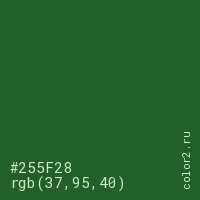 Цвет #255F28 в цветовой модели RGB обозначается тремя октетами (37, 95, 40) в десятичном формате и #255F28 в шестнадцатиричном (hex) формате, которые являются интенсивностью красного 37 (hex 25), интенсивность зелёного 95 (hex 5F) и интенсивность синего 40 (hex 28).
