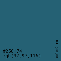 Цвет #256174 в цветовой модели RGB обозначается тремя октетами (37, 97, 116) в десятичном формате и #256174 в шестнадцатиричном (hex) формате, которые являются интенсивностью красного 37 (hex 25), интенсивность зелёного 97 (hex 61) и интенсивность синего 116 (hex 74).