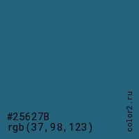 Цвет #25627B в цветовой модели RGB обозначается тремя октетами (37, 98, 123) в десятичном формате и #25627B в шестнадцатиричном (hex) формате, которые являются интенсивностью красного 37 (hex 25), интенсивность зелёного 98 (hex 62) и интенсивность синего 123 (hex 7B).