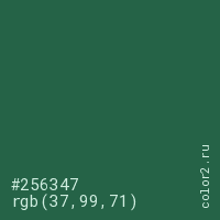 Цвет #256347 в цветовой модели RGB обозначается тремя октетами (37, 99, 71) в десятичном формате и #256347 в шестнадцатиричном (hex) формате, которые являются интенсивностью красного 37 (hex 25), интенсивность зелёного 99 (hex 63) и интенсивность синего 71 (hex 47).
