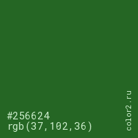 Цвет #256624 в цветовой модели RGB обозначается тремя октетами (37, 102, 36) в десятичном формате и #256624 в шестнадцатиричном (hex) формате, которые являются интенсивностью красного 37 (hex 25), интенсивность зелёного 102 (hex 66) и интенсивность синего 36 (hex 24).