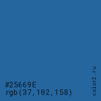 Цвет #25669E в цветовой модели RGB обозначается тремя октетами (37, 102, 158) в десятичном формате и #25669E в шестнадцатиричном (hex) формате, которые являются интенсивностью красного 37 (hex 25), интенсивность зелёного 102 (hex 66) и интенсивность синего 158 (hex 9E).