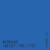 Цвет #2566AC в цветовой модели RGB обозначается тремя октетами (37, 102, 172) в десятичном формате и #2566AC в шестнадцатиричном (hex) формате, которые являются интенсивностью красного 37 (hex 25), интенсивность зелёного 102 (hex 66) и интенсивность синего 172 (hex AC).