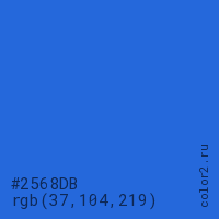 Цвет #2568DB в цветовой модели RGB обозначается тремя октетами (37, 104, 219) в десятичном формате и #2568DB в шестнадцатиричном (hex) формате, которые являются интенсивностью красного 37 (hex 25), интенсивность зелёного 104 (hex 68) и интенсивность синего 219 (hex DB).
