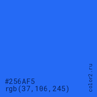 Цвет #256AF5 в цветовой модели RGB обозначается тремя октетами (37, 106, 245) в десятичном формате и #256AF5 в шестнадцатиричном (hex) формате, которые являются интенсивностью красного 37 (hex 25), интенсивность зелёного 106 (hex 6A) и интенсивность синего 245 (hex F5).