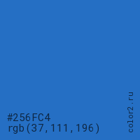 Цвет #256FC4 в цветовой модели RGB обозначается тремя октетами (37, 111, 196) в десятичном формате и #256FC4 в шестнадцатиричном (hex) формате, которые являются интенсивностью красного 37 (hex 25), интенсивность зелёного 111 (hex 6F) и интенсивность синего 196 (hex C4).