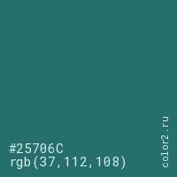 Цвет #25706C в цветовой модели RGB обозначается тремя октетами (37, 112, 108) в десятичном формате и #25706C в шестнадцатиричном (hex) формате, которые являются интенсивностью красного 37 (hex 25), интенсивность зелёного 112 (hex 70) и интенсивность синего 108 (hex 6C).