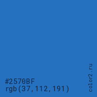 Цвет #2570BF в цветовой модели RGB обозначается тремя октетами (37, 112, 191) в десятичном формате и #2570BF в шестнадцатиричном (hex) формате, которые являются интенсивностью красного 37 (hex 25), интенсивность зелёного 112 (hex 70) и интенсивность синего 191 (hex BF).