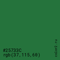 Цвет #25733C в цветовой модели RGB обозначается тремя октетами (37, 115, 60) в десятичном формате и #25733C в шестнадцатиричном (hex) формате, которые являются интенсивностью красного 37 (hex 25), интенсивность зелёного 115 (hex 73) и интенсивность синего 60 (hex 3C).