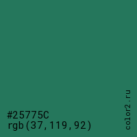Цвет #25775C в цветовой модели RGB обозначается тремя октетами (37, 119, 92) в десятичном формате и #25775C в шестнадцатиричном (hex) формате, которые являются интенсивностью красного 37 (hex 25), интенсивность зелёного 119 (hex 77) и интенсивность синего 92 (hex 5C).