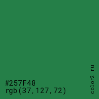 Цвет #257F48 в цветовой модели RGB обозначается тремя октетами (37, 127, 72) в десятичном формате и #257F48 в шестнадцатиричном (hex) формате, которые являются интенсивностью красного 37 (hex 25), интенсивность зелёного 127 (hex 7F) и интенсивность синего 72 (hex 48).