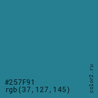 Цвет #257F91 в цветовой модели RGB обозначается тремя октетами (37, 127, 145) в десятичном формате и #257F91 в шестнадцатиричном (hex) формате, которые являются интенсивностью красного 37 (hex 25), интенсивность зелёного 127 (hex 7F) и интенсивность синего 145 (hex 91).