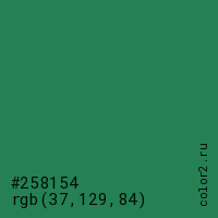 Цвет #258154 в цветовой модели RGB обозначается тремя октетами (37, 129, 84) в десятичном формате и #258154 в шестнадцатиричном (hex) формате, которые являются интенсивностью красного 37 (hex 25), интенсивность зелёного 129 (hex 81) и интенсивность синего 84 (hex 54).
