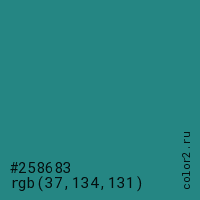 Цвет #258683 в цветовой модели RGB обозначается тремя октетами (37, 134, 131) в десятичном формате и #258683 в шестнадцатиричном (hex) формате, которые являются интенсивностью красного 37 (hex 25), интенсивность зелёного 134 (hex 86) и интенсивность синего 131 (hex 83).