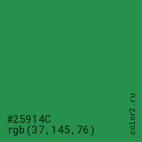 Цвет #25914C в цветовой модели RGB обозначается тремя октетами (37, 145, 76) в десятичном формате и #25914C в шестнадцатиричном (hex) формате, которые являются интенсивностью красного 37 (hex 25), интенсивность зелёного 145 (hex 91) и интенсивность синего 76 (hex 4C).