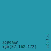 Цвет #2598AC в цветовой модели RGB обозначается тремя октетами (37, 152, 172) в десятичном формате и #2598AC в шестнадцатиричном (hex) формате, которые являются интенсивностью красного 37 (hex 25), интенсивность зелёного 152 (hex 98) и интенсивность синего 172 (hex AC).