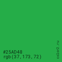 Цвет #25AD48 в цветовой модели RGB обозначается тремя октетами (37, 173, 72) в десятичном формате и #25AD48 в шестнадцатиричном (hex) формате, которые являются интенсивностью красного 37 (hex 25), интенсивность зелёного 173 (hex AD) и интенсивность синего 72 (hex 48).