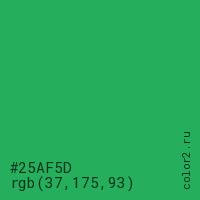 Цвет #25AF5D в цветовой модели RGB обозначается тремя октетами (37, 175, 93) в десятичном формате и #25AF5D в шестнадцатиричном (hex) формате, которые являются интенсивностью красного 37 (hex 25), интенсивность зелёного 175 (hex AF) и интенсивность синего 93 (hex 5D).