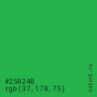 Цвет #25B24B в цветовой модели RGB обозначается тремя октетами (37, 178, 75) в десятичном формате и #25B24B в шестнадцатиричном (hex) формате, которые являются интенсивностью красного 37 (hex 25), интенсивность зелёного 178 (hex B2) и интенсивность синего 75 (hex 4B).