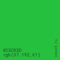 Цвет #25C03D в цветовой модели RGB обозначается тремя октетами (37, 192, 61) в десятичном формате и #25C03D в шестнадцатиричном (hex) формате, которые являются интенсивностью красного 37 (hex 25), интенсивность зелёного 192 (hex C0) и интенсивность синего 61 (hex 3D).