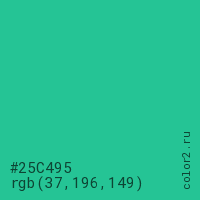 Цвет #25C495 в цветовой модели RGB обозначается тремя октетами (37, 196, 149) в десятичном формате и #25C495 в шестнадцатиричном (hex) формате, которые являются интенсивностью красного 37 (hex 25), интенсивность зелёного 196 (hex C4) и интенсивность синего 149 (hex 95).