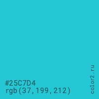 Цвет #25C7D4 в цветовой модели RGB обозначается тремя октетами (37, 199, 212) в десятичном формате и #25C7D4 в шестнадцатиричном (hex) формате, которые являются интенсивностью красного 37 (hex 25), интенсивность зелёного 199 (hex C7) и интенсивность синего 212 (hex D4).