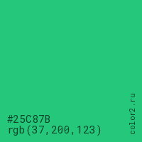 Цвет #25C87B в цветовой модели RGB обозначается тремя октетами (37, 200, 123) в десятичном формате и #25C87B в шестнадцатиричном (hex) формате, которые являются интенсивностью красного 37 (hex 25), интенсивность зелёного 200 (hex C8) и интенсивность синего 123 (hex 7B).