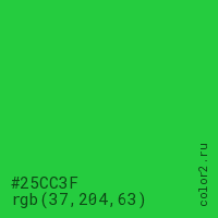 Цвет #25CC3F в цветовой модели RGB обозначается тремя октетами (37, 204, 63) в десятичном формате и #25CC3F в шестнадцатиричном (hex) формате, которые являются интенсивностью красного 37 (hex 25), интенсивность зелёного 204 (hex CC) и интенсивность синего 63 (hex 3F).