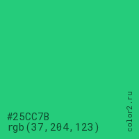Цвет #25CC7B в цветовой модели RGB обозначается тремя октетами (37, 204, 123) в десятичном формате и #25CC7B в шестнадцатиричном (hex) формате, которые являются интенсивностью красного 37 (hex 25), интенсивность зелёного 204 (hex CC) и интенсивность синего 123 (hex 7B).