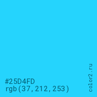 Цвет #25D4FD в цветовой модели RGB обозначается тремя октетами (37, 212, 253) в десятичном формате и #25D4FD в шестнадцатиричном (hex) формате, которые являются интенсивностью красного 37 (hex 25), интенсивность зелёного 212 (hex D4) и интенсивность синего 253 (hex FD).