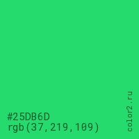 Цвет #25DB6D в цветовой модели RGB обозначается тремя октетами (37, 219, 109) в десятичном формате и #25DB6D в шестнадцатиричном (hex) формате, которые являются интенсивностью красного 37 (hex 25), интенсивность зелёного 219 (hex DB) и интенсивность синего 109 (hex 6D).
