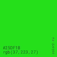 Цвет #25DF1B в цветовой модели RGB обозначается тремя октетами (37, 223, 27) в десятичном формате и #25DF1B в шестнадцатиричном (hex) формате, которые являются интенсивностью красного 37 (hex 25), интенсивность зелёного 223 (hex DF) и интенсивность синего 27 (hex 1B).