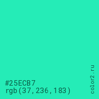 Цвет #25ECB7 в цветовой модели RGB обозначается тремя октетами (37, 236, 183) в десятичном формате и #25ECB7 в шестнадцатиричном (hex) формате, которые являются интенсивностью красного 37 (hex 25), интенсивность зелёного 236 (hex EC) и интенсивность синего 183 (hex B7).