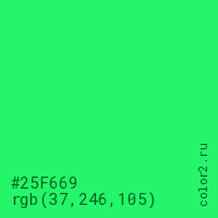Цвет #25F669 в цветовой модели RGB обозначается тремя октетами (37, 246, 105) в десятичном формате и #25F669 в шестнадцатиричном (hex) формате, которые являются интенсивностью красного 37 (hex 25), интенсивность зелёного 246 (hex F6) и интенсивность синего 105 (hex 69).