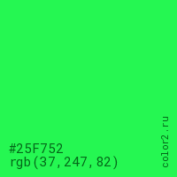 Цвет #25F752 в цветовой модели RGB обозначается тремя октетами (37, 247, 82) в десятичном формате и #25F752 в шестнадцатиричном (hex) формате, которые являются интенсивностью красного 37 (hex 25), интенсивность зелёного 247 (hex F7) и интенсивность синего 82 (hex 52).