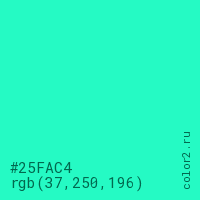 Цвет #25FAC4 в цветовой модели RGB обозначается тремя октетами (37, 250, 196) в десятичном формате и #25FAC4 в шестнадцатиричном (hex) формате, которые являются интенсивностью красного 37 (hex 25), интенсивность зелёного 250 (hex FA) и интенсивность синего 196 (hex C4).