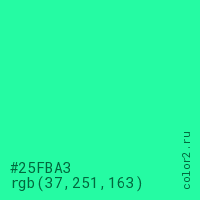 Цвет #25FBA3 в цветовой модели RGB обозначается тремя октетами (37, 251, 163) в десятичном формате и #25FBA3 в шестнадцатиричном (hex) формате, которые являются интенсивностью красного 37 (hex 25), интенсивность зелёного 251 (hex FB) и интенсивность синего 163 (hex A3).