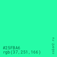 Цвет #25FBA6 в цветовой модели RGB обозначается тремя октетами (37, 251, 166) в десятичном формате и #25FBA6 в шестнадцатиричном (hex) формате, которые являются интенсивностью красного 37 (hex 25), интенсивность зелёного 251 (hex FB) и интенсивность синего 166 (hex A6).