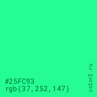 Цвет #25FC93 в цветовой модели RGB обозначается тремя октетами (37, 252, 147) в десятичном формате и #25FC93 в шестнадцатиричном (hex) формате, которые являются интенсивностью красного 37 (hex 25), интенсивность зелёного 252 (hex FC) и интенсивность синего 147 (hex 93).