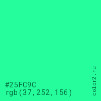 Цвет #25FC9C в цветовой модели RGB обозначается тремя октетами (37, 252, 156) в десятичном формате и #25FC9C в шестнадцатиричном (hex) формате, которые являются интенсивностью красного 37 (hex 25), интенсивность зелёного 252 (hex FC) и интенсивность синего 156 (hex 9C).