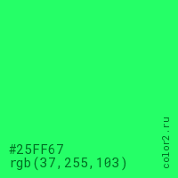 Цвет #25FF67 в цветовой модели RGB обозначается тремя октетами (37, 255, 103) в десятичном формате и #25FF67 в шестнадцатиричном (hex) формате, которые являются интенсивностью красного 37 (hex 25), интенсивность зелёного 255 (hex FF) и интенсивность синего 103 (hex 67).