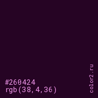 Цвет #260424 в цветовой модели RGB обозначается тремя октетами (38, 4, 36) в десятичном формате и #260424 в шестнадцатиричном (hex) формате, которые являются интенсивностью красного 38 (hex 26), интенсивность зелёного 4 (hex 04) и интенсивность синего 36 (hex 24).