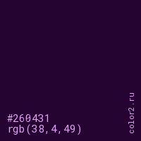 Цвет #260431 в цветовой модели RGB обозначается тремя октетами (38, 4, 49) в десятичном формате и #260431 в шестнадцатиричном (hex) формате, которые являются интенсивностью красного 38 (hex 26), интенсивность зелёного 4 (hex 04) и интенсивность синего 49 (hex 31).