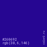 Цвет #260692 в цветовой модели RGB обозначается тремя октетами (38, 6, 146) в десятичном формате и #260692 в шестнадцатиричном (hex) формате, которые являются интенсивностью красного 38 (hex 26), интенсивность зелёного 6 (hex 06) и интенсивность синего 146 (hex 92).