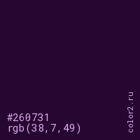 Цвет #260731 в цветовой модели RGB обозначается тремя октетами (38, 7, 49) в десятичном формате и #260731 в шестнадцатиричном (hex) формате, которые являются интенсивностью красного 38 (hex 26), интенсивность зелёного 7 (hex 07) и интенсивность синего 49 (hex 31).