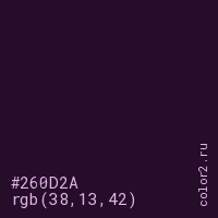 Цвет #260D2A в цветовой модели RGB обозначается тремя октетами (38, 13, 42) в десятичном формате и #260D2A в шестнадцатиричном (hex) формате, которые являются интенсивностью красного 38 (hex 26), интенсивность зелёного 13 (hex 0D) и интенсивность синего 42 (hex 2A).